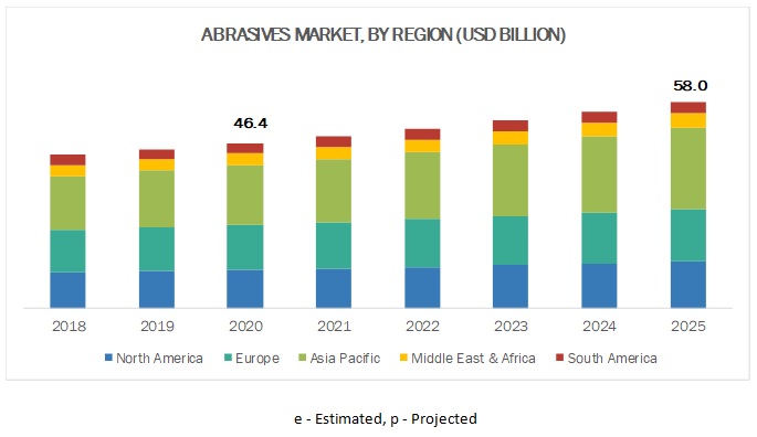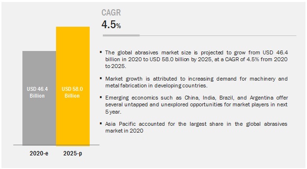 The global abrasives market was valued at USD 46.4 billion in 2020 and is projected to reach USD 58.0 billion by 2025, growing at 4.5% cagr from 2020 to 2025. The growth of this market is attributed to the growing automotive, metal fabrication, machinery, electronics, electrical, medical, and construction industries have contributed significantly towards the growth of the market. However, factors such as uncertainty in economic conditions and rising raw material costs inhibit the growth of the market.